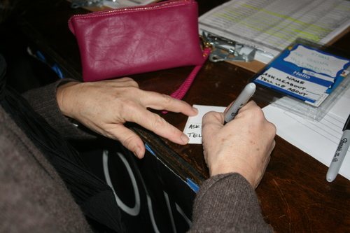 We set up our name tag stations as usual with maps in the main bar on tables and walls. Since this was our launch event we had a new area called Mappy Hour ideas where we heard everyone’s ideas for upcoming events from “wilderness skills” to “bigger name tags.”