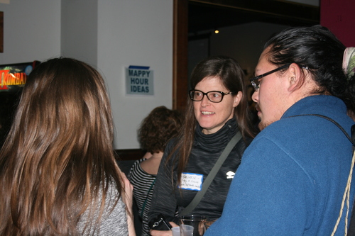 We set up our name tag stations as usual with maps in the main bar on tables and walls. Since this was our launch event we had a new area called Mappy Hour ideas where we heard everyone’s ideas for upcoming events from “wilderness skills” to “bigger name tags.”