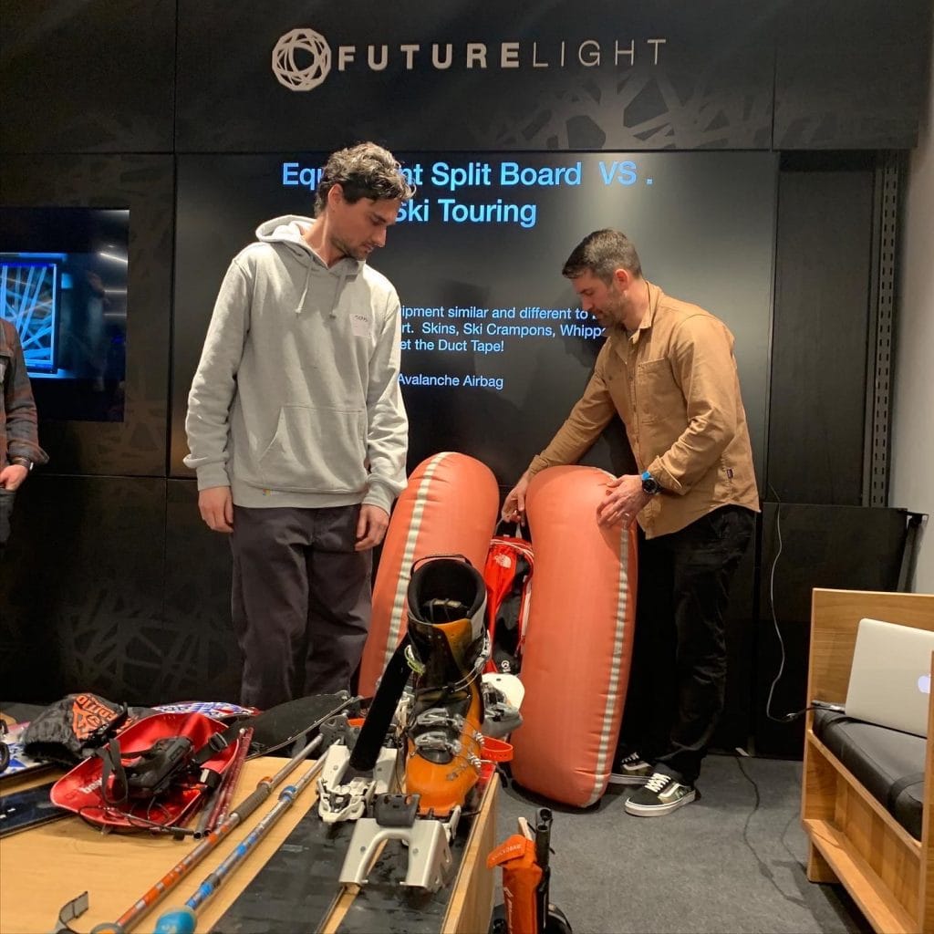 Frank Martin, extreme snowboard extrordinaire, and The North Face’s own Jeff Schomaker, backcountry ski master shared with everyone their fascinating history with backcountry sports. Then they shared everything you need to know to safely get off the lifts and into the mountains. They even selected a volunteer to demonstrate how an airbag works during an avalanche.